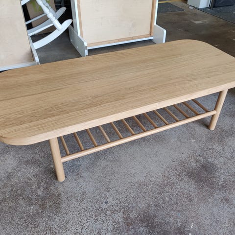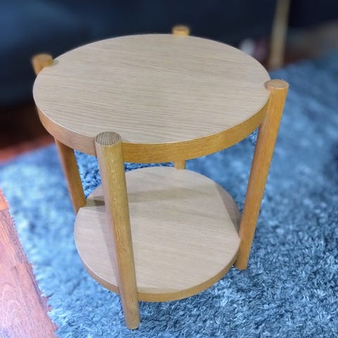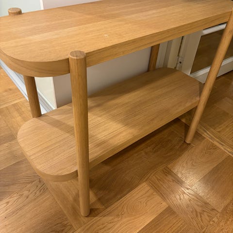 Ikean Listerby sivupöytä, tammiviilua. Pinta siisti ja ehjä mutta värissä pientä haalentumaa.