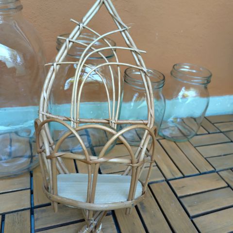Ikääntynyt mutta ehjä rottinkinen kukkahylly. Ehjä ja käyttökuntoinen, vaati ainkastaan puhdistuksen.