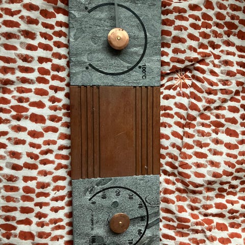 Lämpömittari saunaan. Materiaali keramiikkaa. Mitat 21,5 x 18,5 x 7 cm.