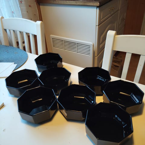 Myydään Arcoroc Octime tarjoilu astioita. Isompi kulho, iso kupu, kaksi isoa tarjoilu lautasta ja kaksi pienempää kulhoa.