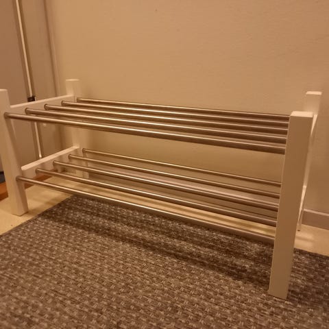 Ikean musta kenkähylly. Päällisosassa ja puun alaosassa pieniä naarmuja, jotka näkyvät valoa vasten. Mitat 108x34x50cl