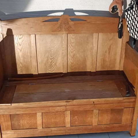 Puinen penkki säilytystilalla ja pehmusteella