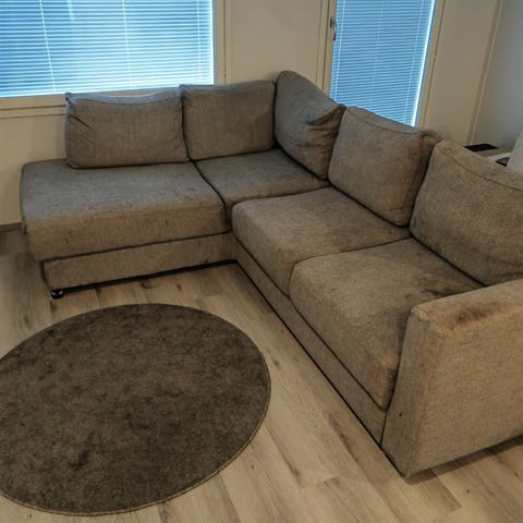 Annetaan Bellus merkkinen harmaa kulmasohva. Heittotyynyt. Löytyy joitakin tahroja. Eläintalous.