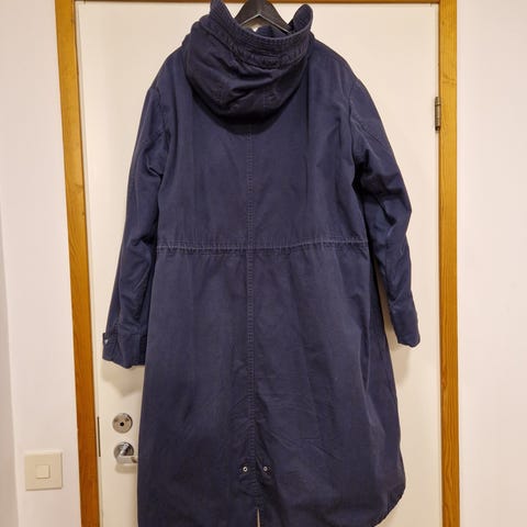 Marimekon parkatakki, puuvillakankaisen takin vuori on irrotettava. Takki monikäyttöinen, ainakin 3 vuoden ajan takki. Kaksoisvetoketjun lisäksi edessä on painonappilista, ja hupussa, vyötäröllä ja polven alapuolelle ulottuvassa helmassa on kiristysnauhat. Rinnan korkeudella olevat viistot halkiotaskut suljetaan painonapilla.