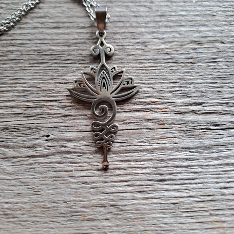 Myydään hopeinen Lotus-riipus ja ketju. Molemmissa hopealeimat. Ketjun pituus 44cm