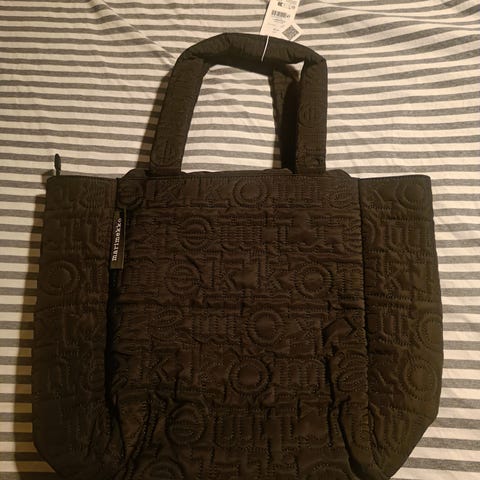 Joy Tote M-laukussa on tikattu Logo-kuosi. Pehmustetussa laukussa on vetoketjusuljenta ja kantokahvat. Marimekko-tuotemerkkilappu on ommeltu toiselle sivulle.