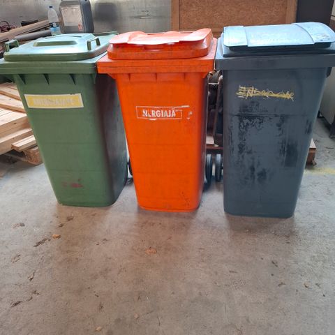 Musta muovinen roskis, varustettu pyörillä liikuttelua varten. Soveltuu jätehuoltoon ja ulkokäyttöön.
