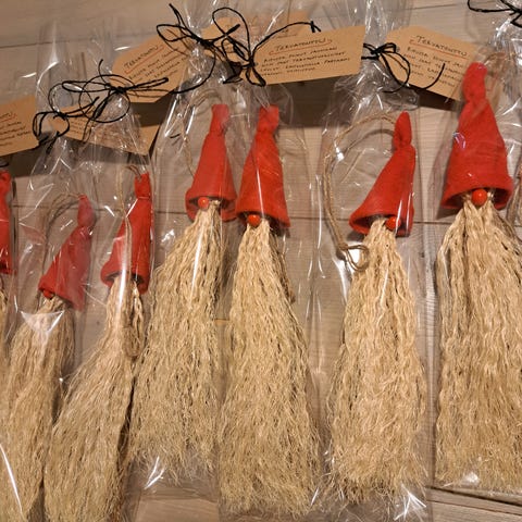 Käsityönä tehtyjä tervatonttuja, tuomaan tuoksua ja tunnelmaa joulusaunaan ja tulevaisuuden saunailtoihin.