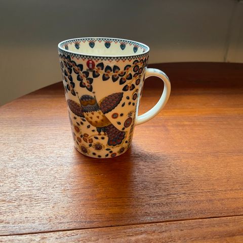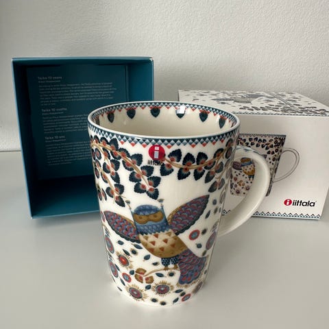 Iittala Taika 10 vuoden juhlamuki, jossa on värikäs lintukuvio. Muki on astianpesukoneen, pakastimen ja uunin kestävä.