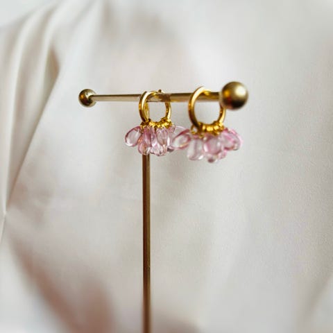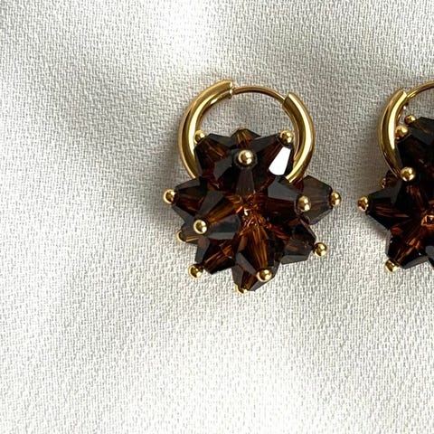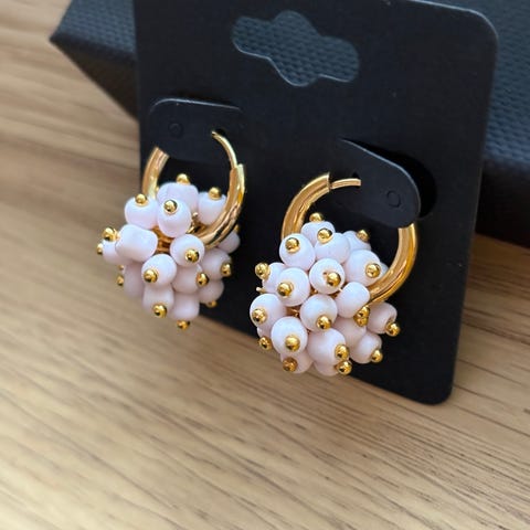 Helmirypäs-korvikset, vaaleanruskeat lasihelmet, korurasiassa. Sirot, pituus noin 2,5cm. Allergisoimattomat kullanväriset renkaat.