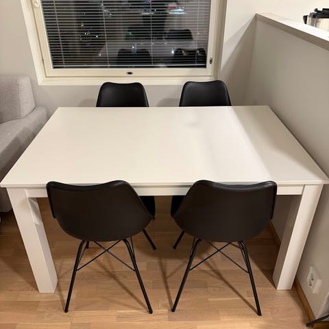 Myydään laadukas valkoinen ruokapöytä ja 4 tuolia. Pöydässä pienen pieni lohkeama reunassa muuten oikein hyväkuntoinen. Kansi kestävää ikilevyä kauniilla vanerireunalla. Tuoleissa käytönjälkiä selkänojien reunoissa. Jos jäljet häiritsee ne saa maalaamalla piiloon tai jos vähän näyttää santapaperia kulmiin saa kauniin kulutetun ilmeen. Nouto Pirkkalasta tai mahdollisuus neuvotella kuljetuksesta.