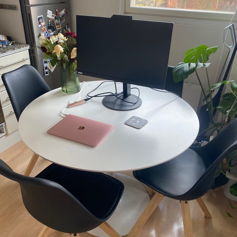 Jysk Pyöreä ruokapöytä valkoisella pinnalla ja nelijalkaisella tukijalalla, vain pöytä ei tuolit. Tukeva puinen rakenne ja pöytätaso ehjä, mutta muutama likatahra (saa varmaan poistettua)