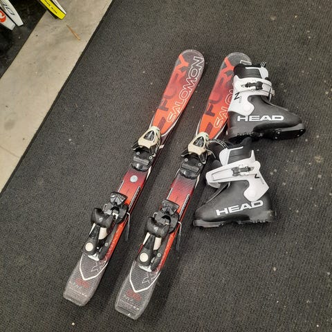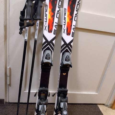 Myydään 90 senttiset Salomon lasten laskettelusukset ja Elan sauvat kokoa 80.