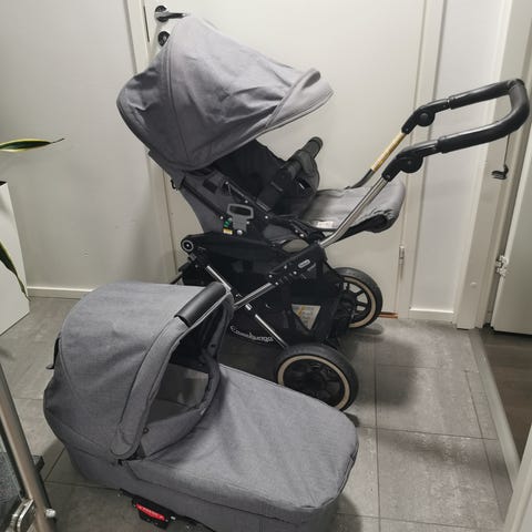 Emmaljunga Viking yhdistelmävaunut, joissa on säädettävä istuinosa ja kantokoppa. Vaunut ovat monikäyttöiset ja soveltuvat eri ikäisille lapsille. Istuinosa on varustettu turvavöillä ja säädettävällä selkänojalla.