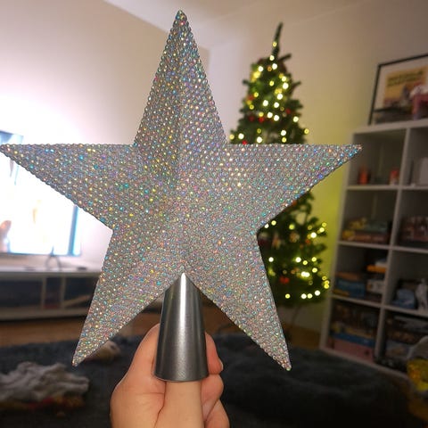 Tinselistä/ hopealangasta tehty hyvin vanha latvatähti, ajalta ennen kuin muovifolio korvasi tinselin.