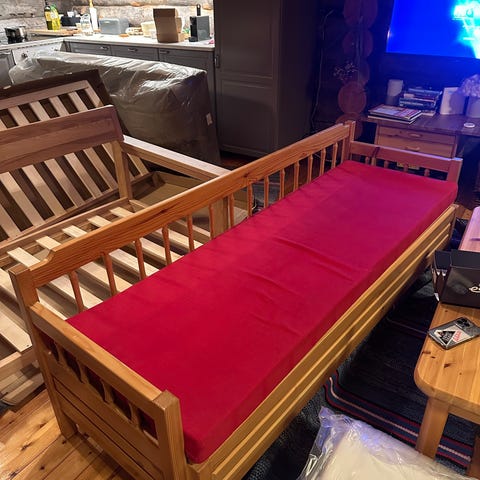 Helppo levittää kahdelle pediksi. Patja joka kuvassa näkyy soveltuu levitettäväksi ( taitettava, todella hyvä ja kiinteää materiaalia ) .