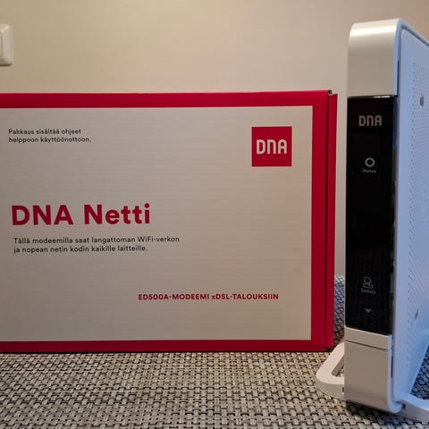 Mitat 11*9,5*2,5 cm. Modeemi kytketään puhelinlinjaan eli kuparilaajakaistaan. 2 ethernet-porttia.