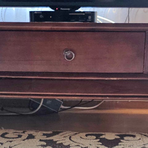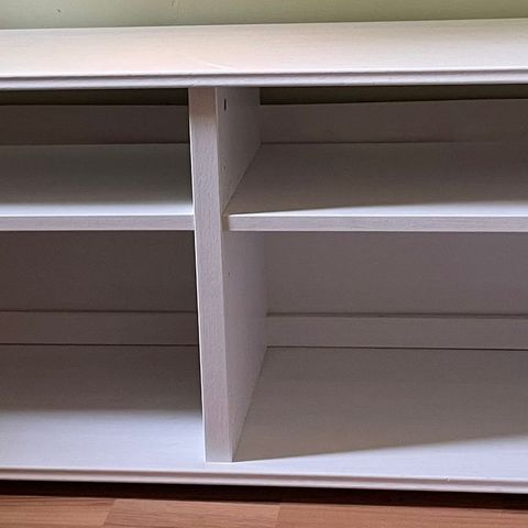 Pähkinä pinnoitteella oleva tv- taso, kahdella klaffi ovella ja avo hyllyllä.
