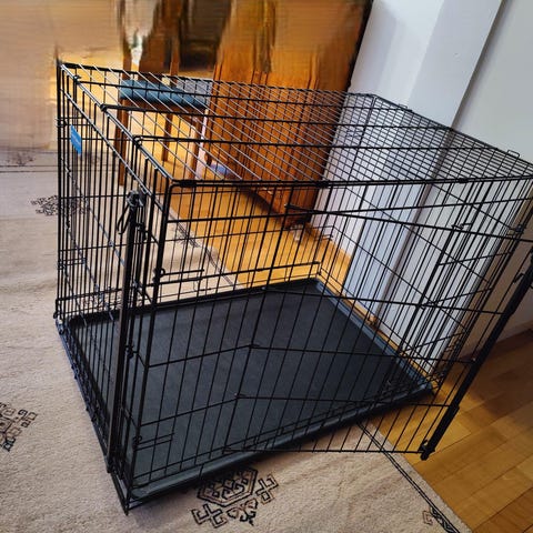 Metallinen koiran häkki kahdella ovella. Jäänyt käyttämättömäksi. Pieniä kulumisen jälkiä vähän ympäriinsä näkyy yhdessä kuvassa.