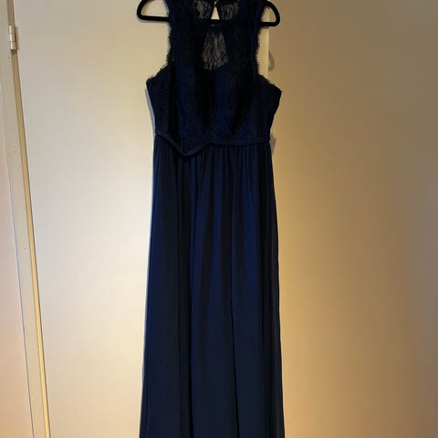 Näyttävä vihreä iltapuku, jossa mustalla pitsillä somistettu yläosa. Koko 36. Helma on hieman laahustyyppisesti takaa muutaman kymmenen senttiä pitempi kuin edestä.