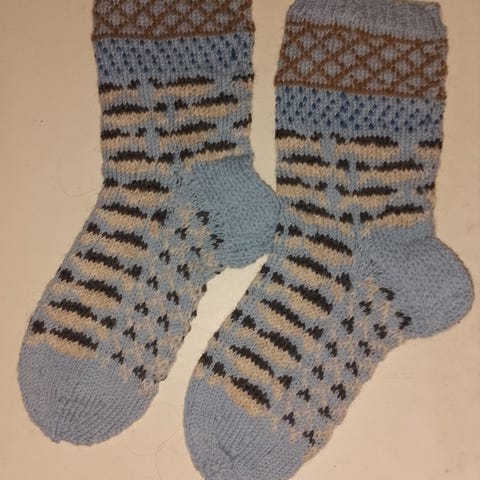 Villasukat Nalle langasta. Varren mitta 16 cm ja jalkaterä 27.5 cm. Postikulut tarvittaessa 6e s-kokoisessa paketissa tai vaihtoehtoisesti Toridiilin kautta.