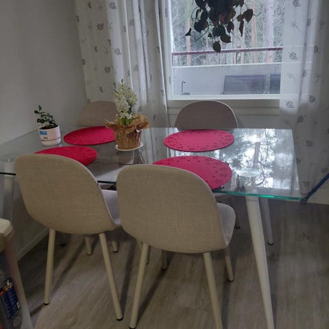 2 hengen ruokailuryhmä, lasipöytälevyn koko on 70cmx70 cm ja korkeus 76 cm. Tuolin mitat 84cmx50cmx41cm. Noutomyynti.