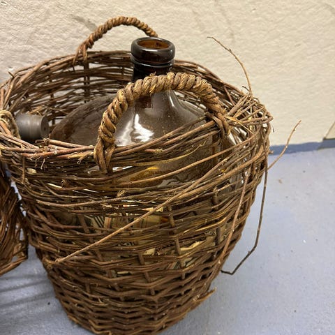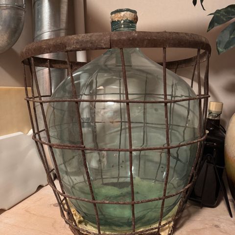 Vanha suuri pullo, AIV-pullo, vihreä. Pullo ja kori kumpikin ehjät. Korin halkaisija 47 cm leveimmässä kohdassa.