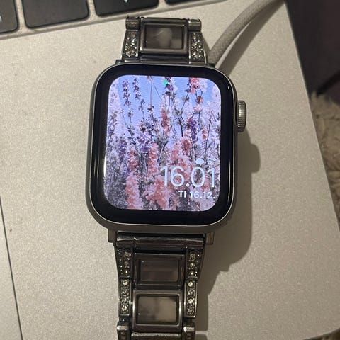 Apple Watch SE älykello 40mm, beige silikoniranneke. Akun kapasiteetti 98 %. Mukana alkuperäinen latauskaapeli ja pakkaus.