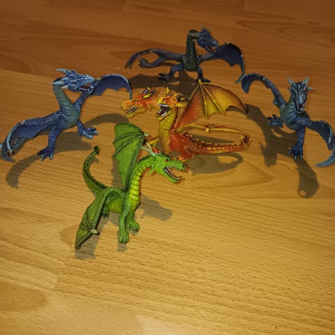 Sisältää kaksi lohikäärmettä. Kummallakin siivet rikki.