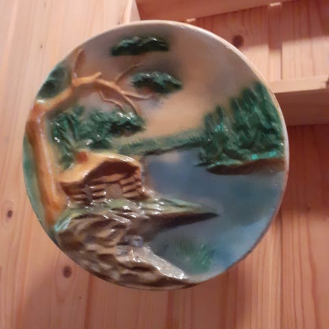 Kipsitaulu - Norja, Oslo, 1950. Patinoitunut kipsitaulu vuodelta 1950. Takana merkintä 11/50. Halkaisija 24,5 cm. Metallinen ripustuslanka.