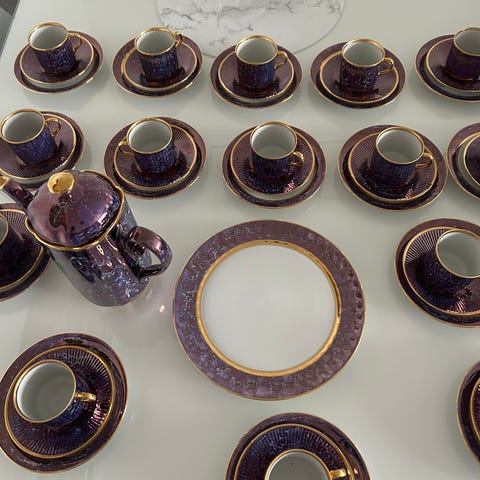 Kahviastiasto kuin koru, laadukas. kultaukset. katso kuvat. 6 kuppia ja tassit, 6 leipälautasta, 1 iso tarjoiluvati, 1 kannellinen sokeriastia, 1 kermanekka, taitavat olla lähes käyttämättömät. Yhdessä leipälautasessa valmistuksen pistemäinen vaje, kuva. Kupit korkeus n. 7 cm, tassi n. 13 cm, vati n. 24 cm. ja pullalautaset n. 17 cm, sokerikko kannella n. 11 cm ja kermakko n. 10 cm. hinta noudettuna. voin lähettää + lähetyskulut 14€