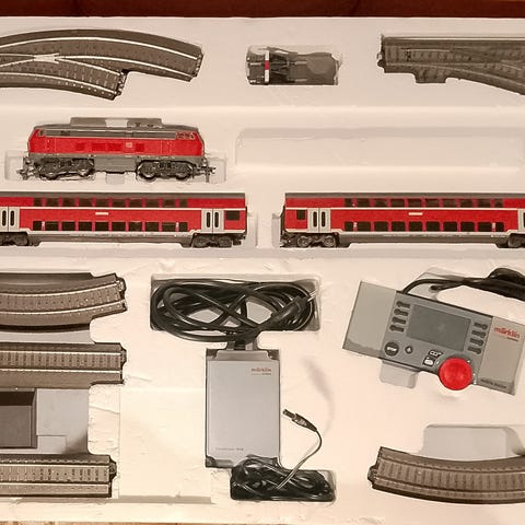 Märklin HO Set-S pienoisjunarata sisältää höyryveturin, kaksi matkustajavaunua ja kaksi avotavaravaunua. Setissä on mukana useita kaarevia ja suoria ratakiskoja sekä sinivihreä ajomuuntaja punaisella säätimellä.Sisältää veturin, 4 vaunua, ratakiskot ja ajomuuntajan. Mittakaava HO. Alkuperäinen pahvinen pakkaus on kulunut ja siinä on useita repeämiä.Valmistaja: MärklinVäri: monivärinen (musta, harmaa, punaruskea)Materiaali: muovi, metalliTuote on tarkistettu