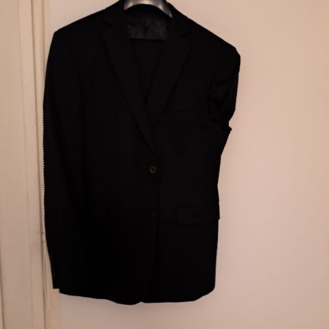 Hyväkuntoinen himmeä liituraita, tummansininen, harmaa, himmeä kultaraita. Materiaali: villa. Huom toimitus 4.1. lähtien.