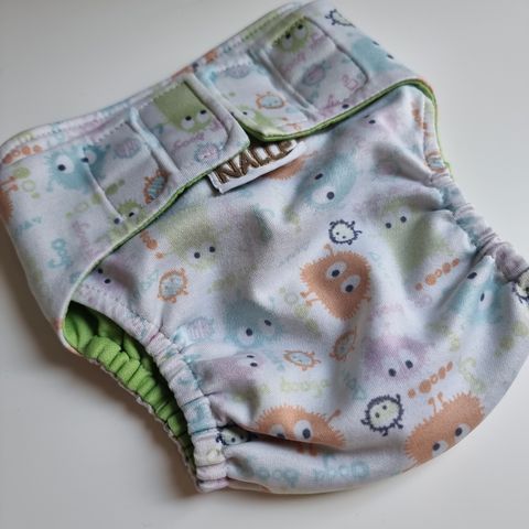 Kaksi Nalle-merkkistä sisävaippaa koossa NB. Kiinteät imut, ei täyttöaukkoa. Molemmissa vähän värjäymää, joka saattaa lähteä sappisaippualla pois.
