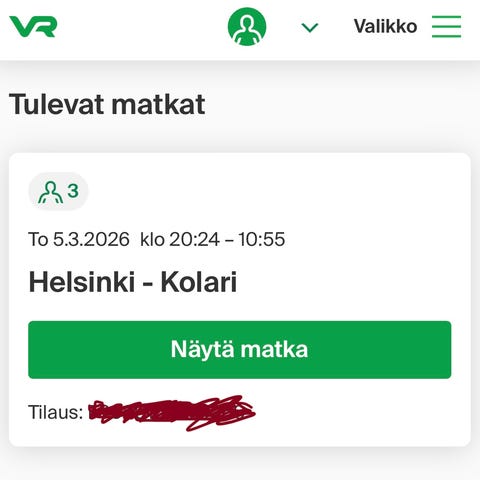 Liput yöjuniin välille 1.1.-6.1 Pasila-Kolari. Lippu sisältää paikan yhdelle autolle, sekä paikat kahdelle aikuiselle ja yhdelle lapselle kolmen hengen makuuhytissä.