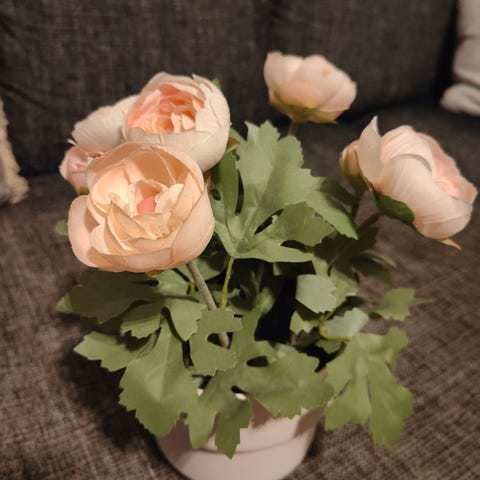 Tekokukkakimppu + ruukku vaaleanpunaisilla kukilla ja vihreillä lehdillä