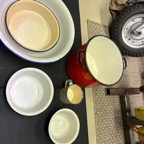 Hyväkuntoinen, pohjassa vain jälkiä, sankojen alapuolella olevat vaaleat kohdat ovat vain maalittomia kohtia, ei esim. kolhittuja. Lisääkin tulee näitä suloisia emaliastioita myyntiin sitä mukaa kun ehdin kaappeja päivittää.