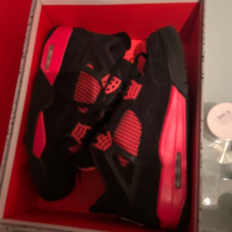 Air Jordan 4 Red thunderit koko 44. Kenkiä ollaan käytetty vain muutaman kerran. Kengät on ostettu Lontoosta ja laatikko tulee kenkien mukana