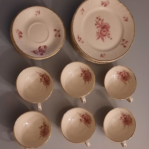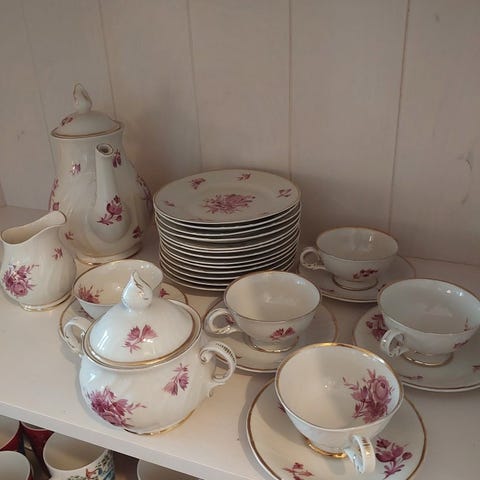 Myydään Arabian Regina-astioita. Kaikki ehjiä. Sokerikko, kermakko, kahvikannu (kansi puuttuu), 1 kpl 26cm lautanen ja 2 kpl 17cm lautasia.