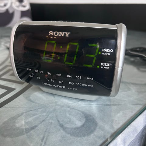 Kuution muotoinen valkoinen kelloradio herätyksellä, mitat noin 10cm kanttiinsa. Verkkoliitäntä, nappiparisto (mukana) pitää kellonajan muistissa mutta ei toimi varavirtana. Käyttöohje ei tallessa.