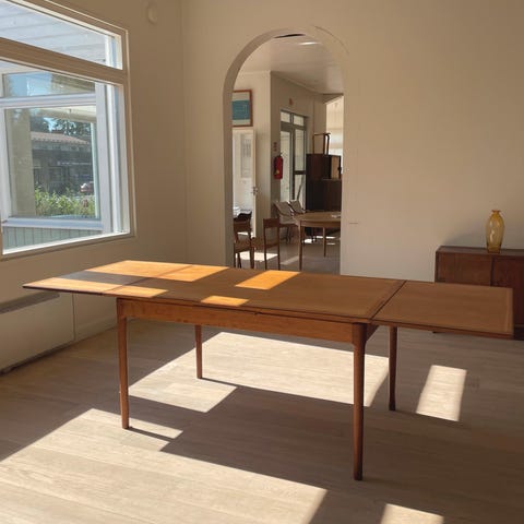 Henning Kjærnulfin suunnittelema vaaleatamminen tanskalainen kaunis jatkettava ruokapöytä 1960-luvulta.