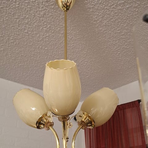 Todella kaunis 1950-luvun romanttinen Sarion valaisintehtaan 5-kupuinen messinkivalaisin vanhoilla opaalilasikuvuilla (valmistajan leima rungossa - viimeinen kuva). Valaisimessa on kauniisti patinoitunut messinkirunko ja romanttisen koristeelliset sähköosien päällä olevat messinkiset kupit ja mansetit. Valaisimessa on lisäksi todella hienot messinkiset kiiltävät lehtikoristeet rungon keskiössä ja messinkiset jousikoristeet sekä alakuvun että mansettien alla. Valaisin on varustettu Riihimäen lasitehtaan tuotannossa 1950-luvulla valmistetuilla vanhoilla pyöreämuotoisilla valaistusaukostaan rypytetyillä täysin ehjillä opaalilasikuvuilla, joiden läpi valo siivilöityy lämpimästi ja valaisee häikäisemättömästi viidellä valopisteellä suuremmankin huoneen. Kuvut on esitelty esim. Itsun vuoden 1956 kuvastossa mallinumerolla 1406 maalattu väriopaalikupu ja näitä kupuja käyttivät valaisintehtaat Suomessa yleisesti. Valaisimessa on aikakautensa mukaiset sähköosat ja maadoittamattomat sähköt. Uudet led-polttimot sisältyvät hintaan. Valaisinpistokkeesta voidaan sopia tarpeen mukaan erikseen.