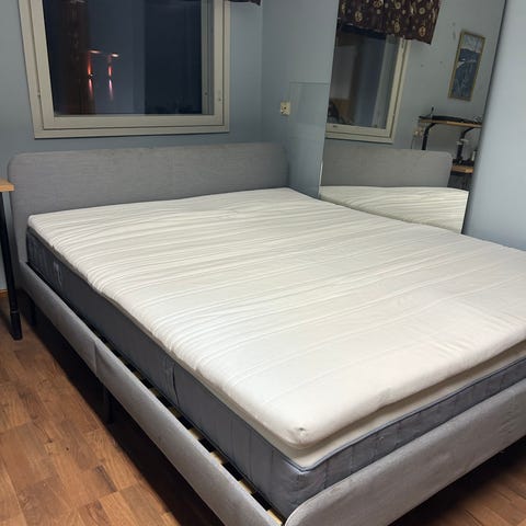 Myydään Ikean Slattum- merkkinen sängynrunko. Materiaali metallia ja kangasverhoilu. Väri harmaa. Leveys 140cm ja pituus 200cm . Sopii hyvin kapeaksi parisängyksi/ leveämmäksi nuorisosängyksi. Myydään purettuna ja kokoamisohje löytyy. Ruuvit pakattuna talteen. Maksu käteisellä ja vain nouto.