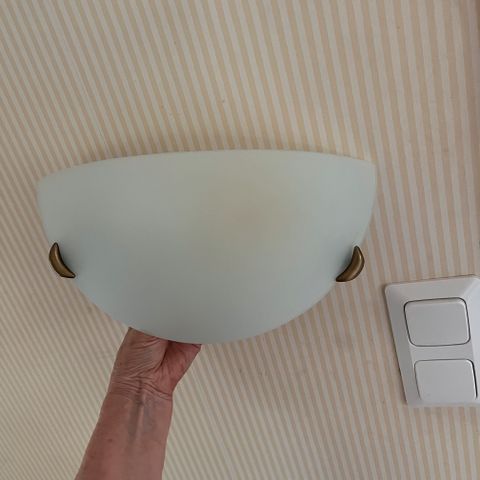 Materiaali messinkiä ja maitolasia. Polttimo E14 kanta. Lasikuvun sisäpuolella yhdessä kohtaa reunassa pieni kolo (näkyy viimeisessä kuvassa keskellä). Kuvun asento säädettävissä.