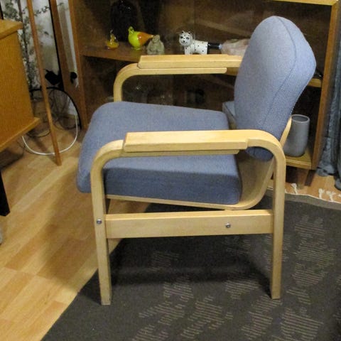 Uudelleen verhoiltu 50-luvun korkeaselkänojallinen nojatuoli. Verhoilu on ehjä. Runko kaipaa ehostusta. Nouto