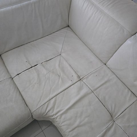 Nahkasohva(Italsofa) päällinen ehjä, joskin kulunut. Käytetyimmissä kohdissa istuintyynyt painuneet. Saa kahteen osaan. Vain nouto.