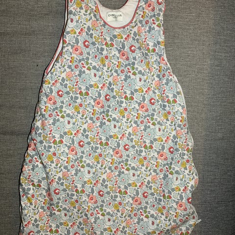 Unipussi vauvalle. Takana nepparit, joilla pussin voi lyhentää. Olka-helma pituus 65cm, joten saattaisi mennä vielä 68-kokoon asti. Lapussa tog-arvoksi merkitty 2.73. Ei ehkä aivan niin muhkealta tunnu enää, olisiko 2.0 lähempänä. Valkoisessa pussissa kuviona vaaleanpunaiset sydämet. Sivussa vetoketju.