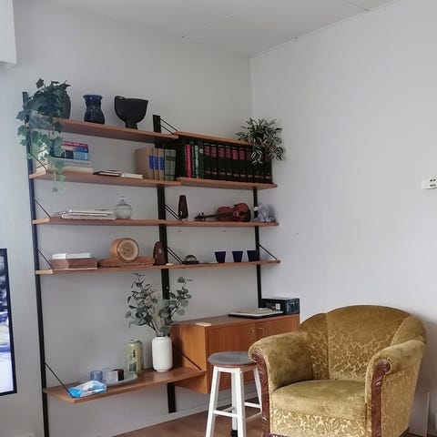 Moduuleista koostuva hyllykokonaisuus. Yhden moduulin leveys on 80 cm ja korkeus 60cm. Koko kokonaisuus 250 euroa tai 30 per moduuli.