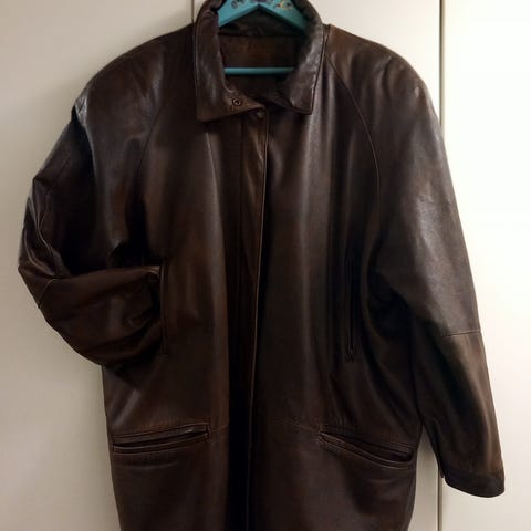pehmeää nahkaa. vähän erikoisemmat napit. nappien pinnoissa naarmua. weatherd mutta hyvässä kunnossa. lämmin, pärjännyt pakkasessa villapaidan kanssa. sopii myös naisille, vyötäröllä on tilaa. takin voi stailata monilla eri tavoilla riippuen siitä mitkä napit jättää auki