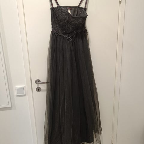 Myydään harmaa/hopeinen iltapuku. Koko lappu 2, ollut käytössä 36-38 kokoisella.